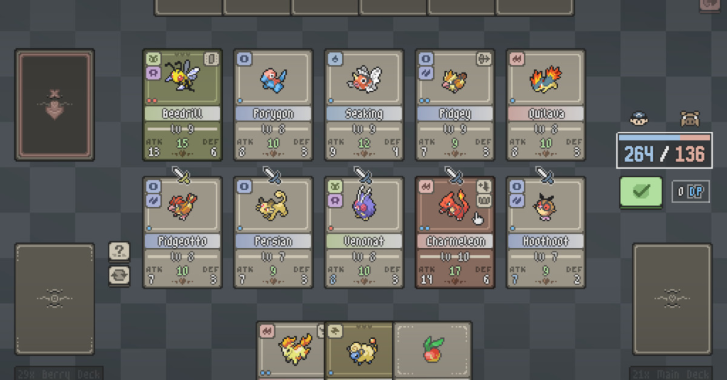 È un ingegnoso matrimonio di due concetti. Come Inscryption, il tavolo da gioco virtuale di Pocket Crystal League ha una riga in cui è possibile posizionare le carte, per attaccare le carte nemiche. Ma invece dei giochi del puzzle horror ermellino e lupi, queste carte contengono Pokémon di prima e seconda generazione. Dall’apertura di Pocket Crystal League, il gioco richiede ai giocatori di selezionare un mazzo Erba, Fuoco o Acqua e ognuno di essi ha vantaggi di tipo contro le carte Pokémon nemiche.