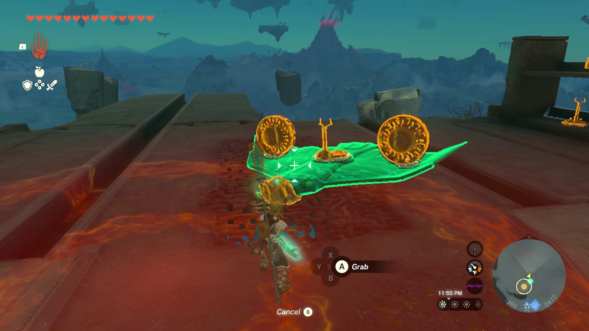 Una volta dentro, interagisci con l’altare per ottenere una scatola con il braccio sinistro all’interno. Colpisci la ruota attaccata alla porta per sollevare la porta e portare la scatola con te. La porta avrà tre ruote, una sul lato da cui sei entrato e due sul lato con la lava. Togli le due ruote sul lato lava e attaccale alla scatola, insieme al vicino bastone dello sterzo in questo modo: