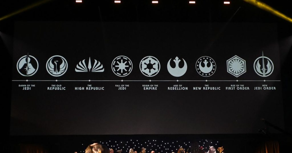 La presidente della Lucasfilm, Kathleen Kennedy, ha mostrato sullo schermo un’immagine con la linea temporale appena ampliata, che parte da Dawn of the Jedi, passando per Old Republic, High Republic, Fall of the Jedi, Reign of the Empire, Age of Rebellion, New Republic, Rise of the Primo Ordine, al Nuovo Ordine Jedi.