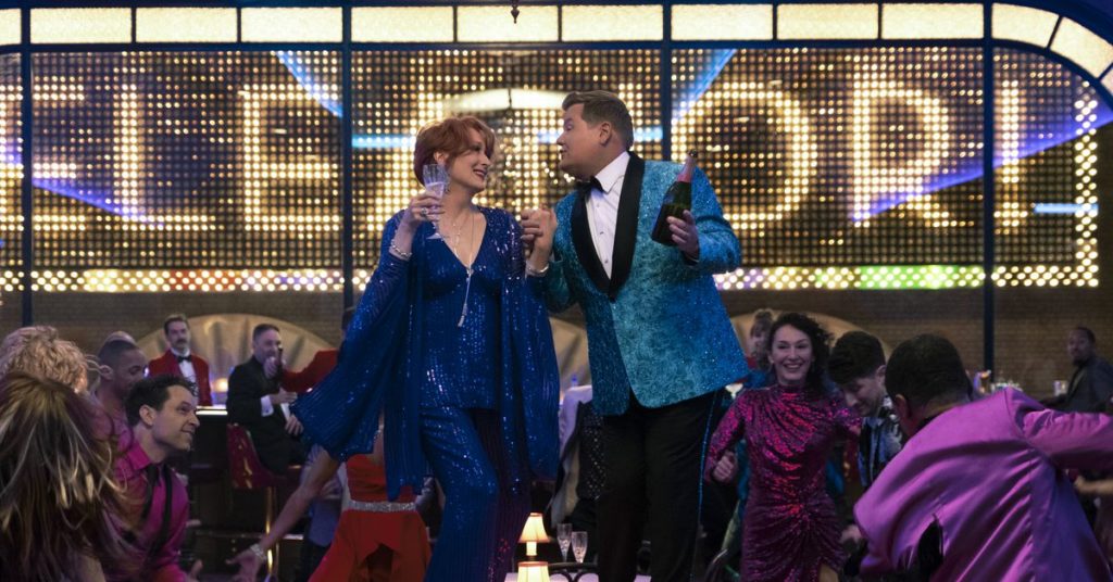 Il ballo di fine anno presenta Emma Nolan (Jo Ellen Pellman), l’analogo di McMillen, in una scena di apertura che chiarisce con cosa si trova di fronte. A Edgewater, Indiana, l’incontro del PTA guidato dalla signora Greene (Kerry Washington, continuando il suo turno di Little Fires Everywhere con un altro ruolo contro il tipo), durante il quale i genitori scelgono di annullare il ballo di fine anno invece di esporre i loro preziosi figli al loro compagno di classe che sembra essere una lesbica, è un pozzo di disperazione nella vita reale. “Non abbiamo scelta”, dice ipocritamente la signora Greene. Poi The Prom ci porta a New York City, dove il due volte vincitore del Tony Dee Dee Allen (Meryl Streep) e l’eterno secondo classificato Barry Glickman (James Corden) sono scioccati dal fatto che il loro nuovo musical su Eleanor Roosevelt abbia ricevuto recensioni negative. “Ho messo quella parrucca e quei denti protesici e so che sto cambiando la vita”, ha detto Dee Dee a un giornalista sul tappeto rosso, e quell’arroganza è ciò che convince Dee Dee, Barry, collega sfortunato attore Trent Oliver (Andrew Rannells) e la disoccupata del coro di Chicago Angie Dickinson (Nicole Kidman) per cogliere la narrativa di Emma come un’opportunità e marciare a braccetto lungo una Broadway fortemente CGI per celebrare il loro spirito filantropico.