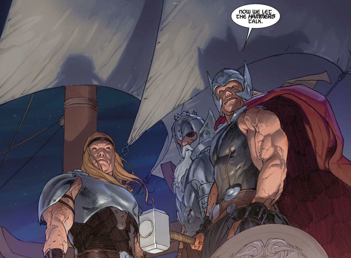 Se devo essere onesto, consiglio vivamente di leggere l’intera serie di Thor di Jason Aaron. Ma questa non è una richiesta facile per nessuno, ma per coloro che sono già insolitamente seri riguardo ai fumetti. Quindi non posso chiederti di ottenere un abbonamento Marvel Unlimited. Sarebbe irragionevole per me suggerirti su Google un elenco di ordini di lettura. E sicuramente non posso dirti di accontentarti di oltre un centinaio di numeri di azione pulp, emozioni intense e disegni assolutamente meravigliosi di artisti del calibro di Esad Ribić e Russell Dauterman. Sarebbe sciocco.