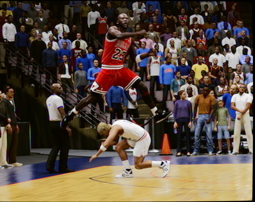 “Ecco Jordan per tre… sì!” Marv Albert ha detto alla trasmissione della NBC. “Hai visto quello sguardo? Michael, indicando… non riesce a crederci!” Immagine: Visual Concepts/2K Sports