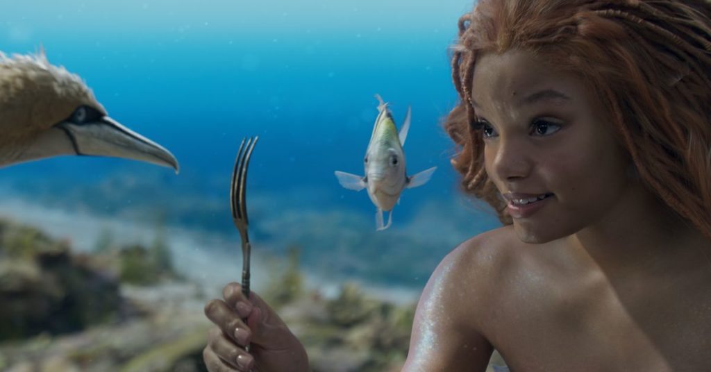Non è chiaro se quelle scene in The Little Mermaid siano intenzionalmente esilaranti o se sia solo un effetto collaterale degli animali fotorealistici. Ma il realismo è giocato per le risate abbastanza spesso da sembrare il primo. Il Tritone di Javier Bardem che si china per avere un cuore a cuore serio con un granchio è meraviglioso. Così è la scena in cui Flounder ansima per respirare e si lascia cadere sul ponte di una nave mentre cerca di dire qualcosa ad Ariel, fino a quando Sebastian, che non ha il tempo di vegliare su un altro giovane ribelle, lo spinge giù dalla barca e torna dentro l’acqua. Anche Scuttle ha i suoi momenti, emettendo forti suoni odiosi di gabbiano e generalmente svolazzando e mettendosi in mezzo, come fanno i gabbiani.