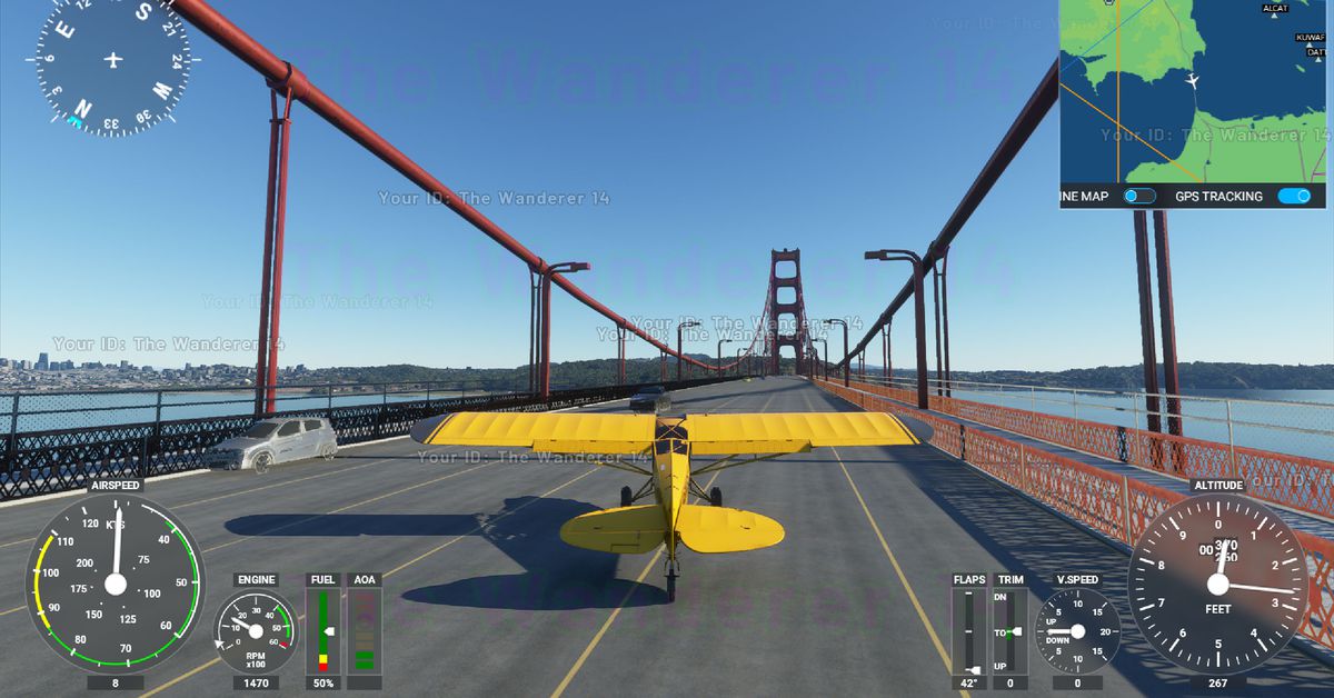 Atterraggio sui ponti: oltre a volare sotto i ponti, sappi che puoi anche attraversarli. Ho fatto atterraggi touch-and-go sul Golden Gate Bridge per un intero pomeriggio. Per fortuna, i veicoli non sono oggetti di collisione in Flight Simulator. I supporti Bridge, invece, lo sono sicuramente.