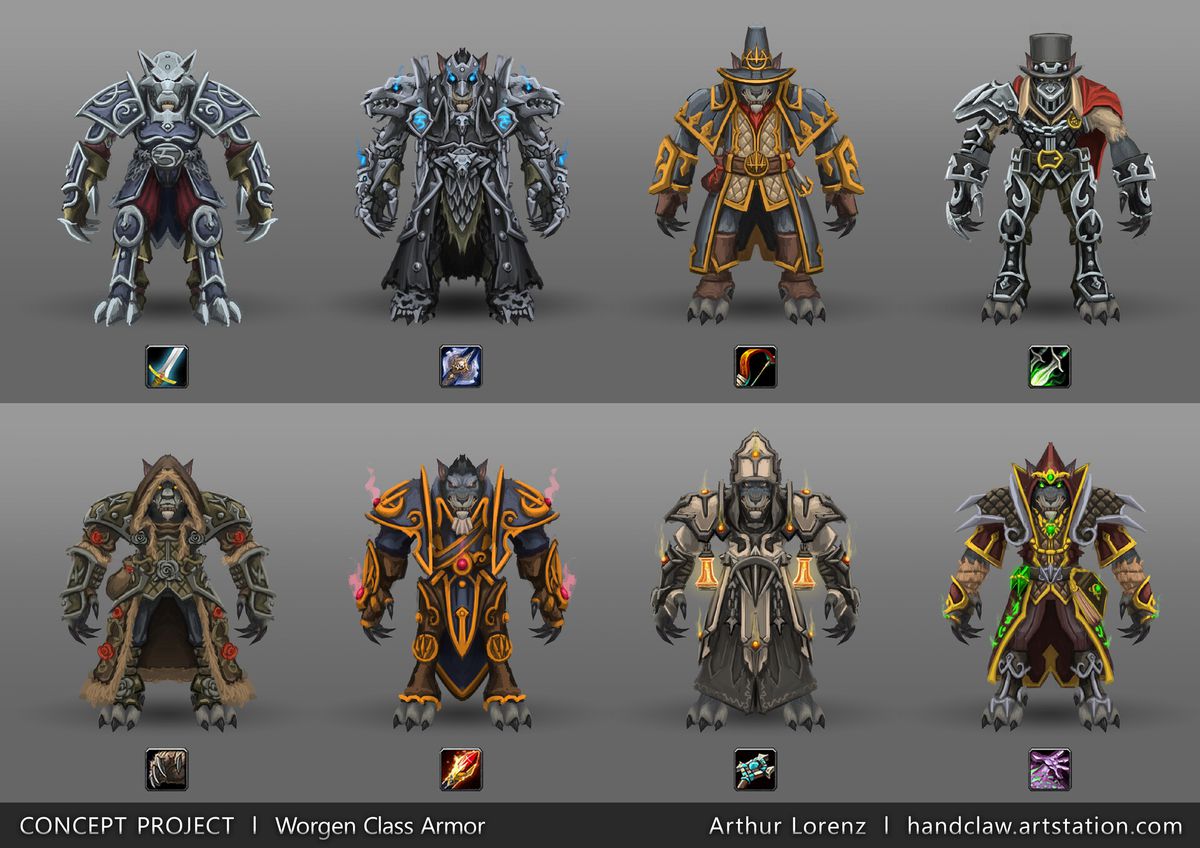 Un fan artist con il manico Handclaw è diventato costantemente virale sui forum di World of Warcraft durante le ultime due espansioni, e questo perché la sua arte è di una cosa specifica che i giocatori desiderano molto. Handclaw, noto anche come Arthur Lorenz, ha creato concept art dettagliati per centinaia di possibili set di armature.