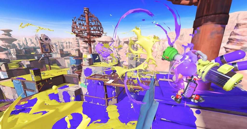 In Splatoon spari inchiostro invece dei normali proiettili. Puoi nuotare facilmente attraverso il tuo inchiostro a colori, mentre l’inchiostro del nemico ti rallenterà e ti renderà più vulnerabile agli attacchi. In una modalità di gioco chiamata Turf War, due squadre di quattro competono l’una contro l’altra per cercare di coprire la mappa con il loro inchiostro. Vince la squadra che copre più mappa.