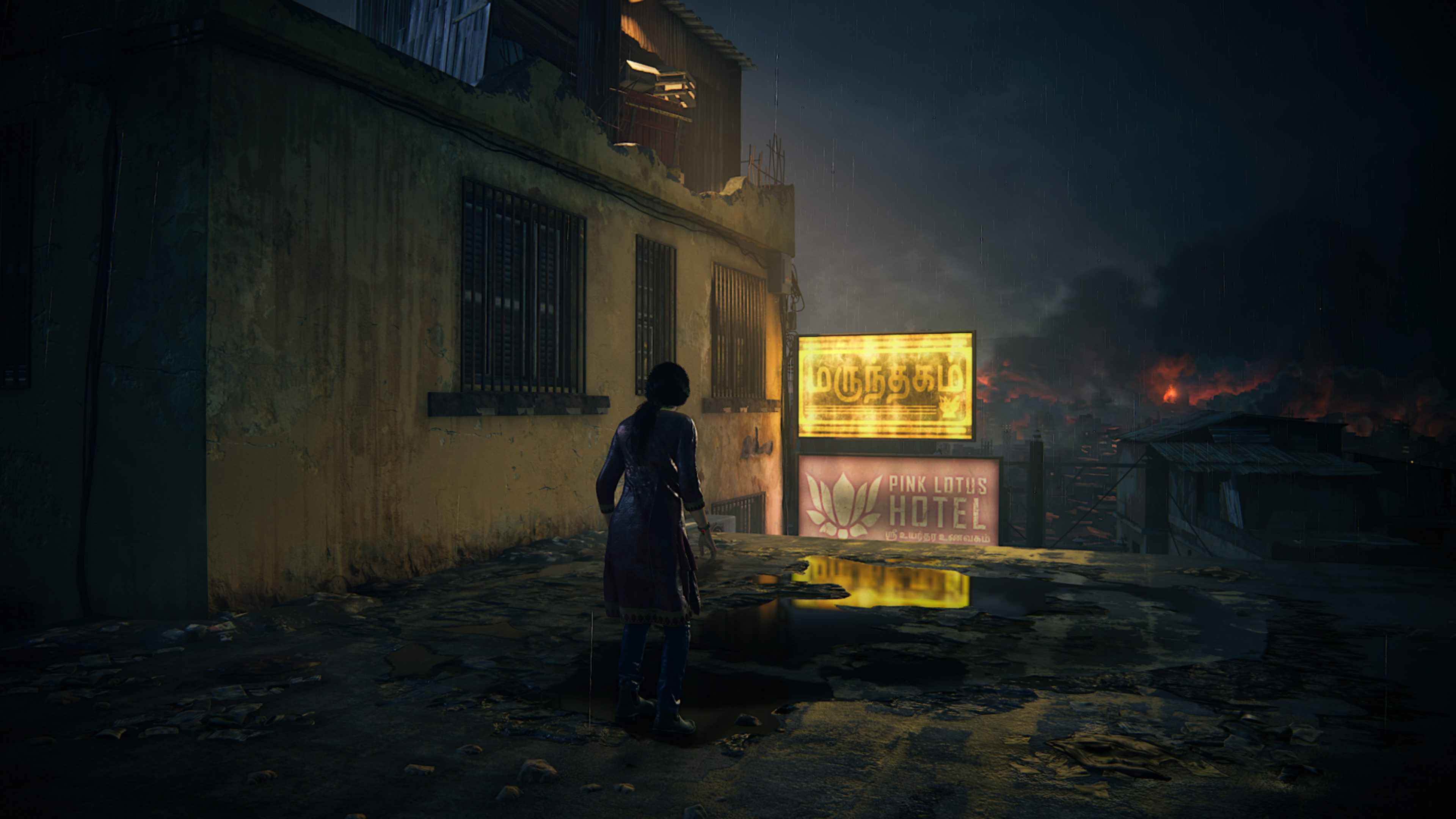 Chloe esplora una città indiana devastata dalla guerra in Uncharted: Legacy of Thieves Collection, remaster per PS5 di Uncharted: The Lost Legacy, visto in modalità Fedeltà (4K, 30 fps) a sinistra e in modalità Performance Plus (1080p, 120 fps) a destra . Il testo sui cartelli è molto più nitido in modalità Fedeltà, ma il riflesso nella pozza sul tetto, così come le fiamme e il fumo sullo sfondo, è lo stesso. Immagine: Naughty Dog/Sony Interactive Entertainment tramite Viaggio247 e Immagine: Naughty Dog /Sony Interactive Entertainment tramite Viaggio247