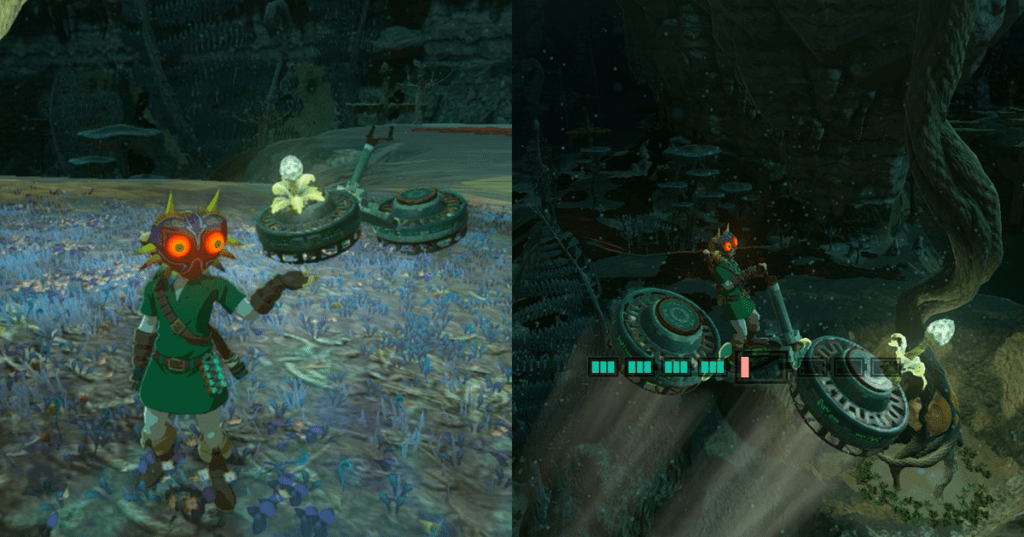Fortunatamente, non è necessario entrare nel Gloom per correre nelle profondità. Puoi cavalcare un cavallo scheletro, ad esempio, montando quelli che vagano all’impazzata o rubandone uno a un Bokoblin. Oppure, se sei un vero innovatore, puoi costruire un’auto, un’hoverbike o un aereo, o anche tentare di portare con te il tuo veicolo carico di dispositivi Zonai nelle Profondità. Una manciata di fan ha iniziato a fare proprio questo – con, diciamo, una serie di successi – girando per le profondità senza alcuna preoccupazione al mondo.
